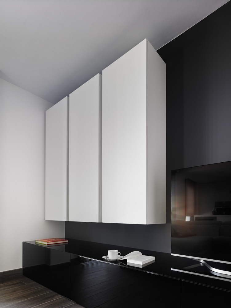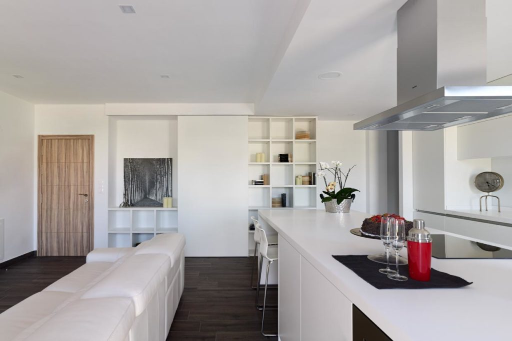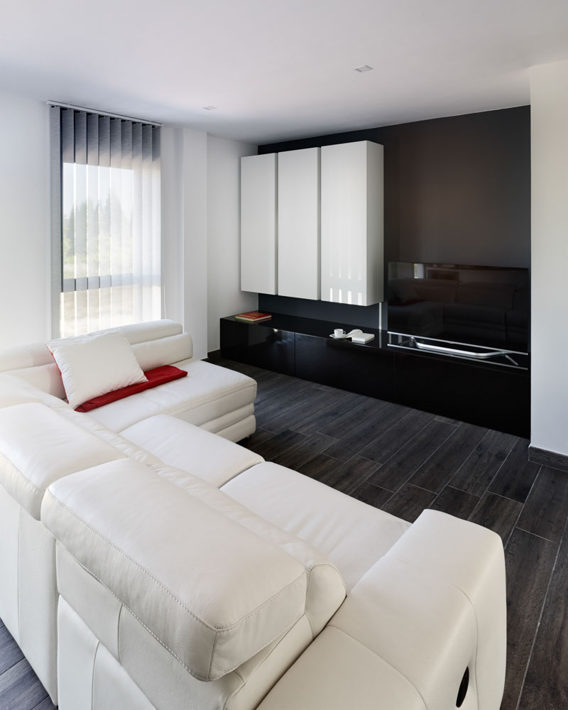 En este diseño existe un predominio del blanco, con toques de color en negro y rojo que proporcionan el contraste necesario en todas las estancias. También integramos la cocina con el salón, aportando mucha amplitud al espacio principal de la casa.